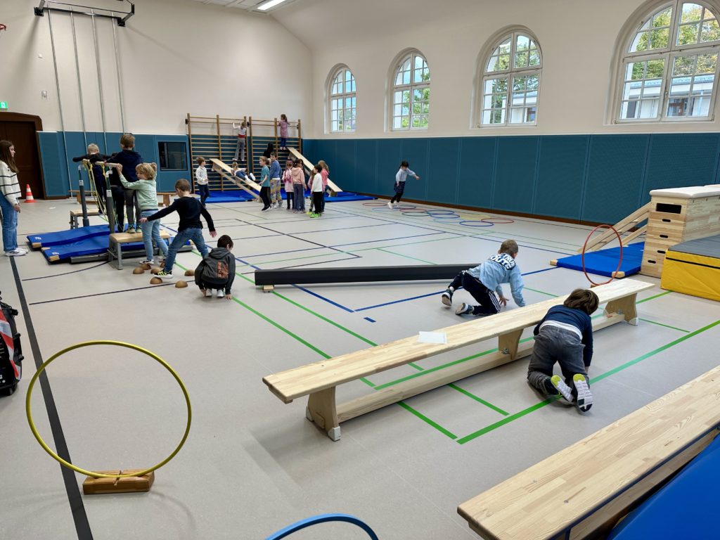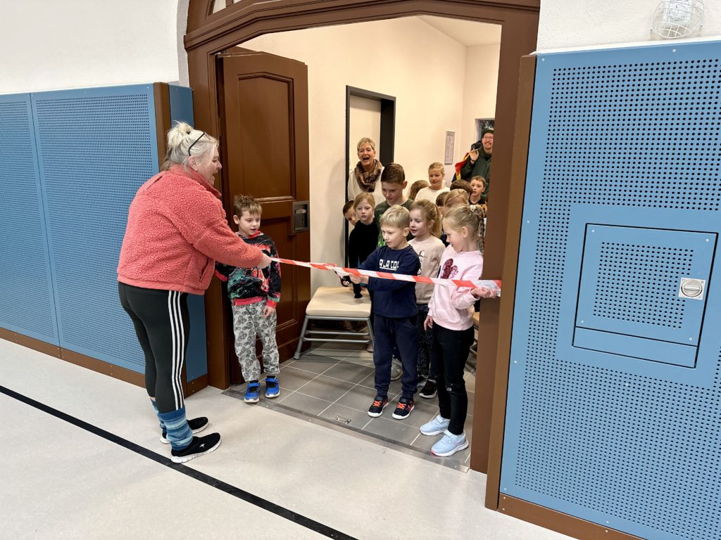 Der offizielle Teil der Eröffnung begann mit einer feierlichen Zeremonie, bei der ein symbolisches Band durchtrennt wurde. Im Anschluss durften die Kinder die neue Halle auf ganz besondere Weise erkunden: Ein abwechslungsreicher Hindernisparcours wartete darauf, durchlaufen zu werden. Mit Begeisterung kletterten, sprangen und balancierten die Schülerinnen und Schüler über Matten, Bänke und neue Geräte, die künftig den Sportunterricht bereichern werden.